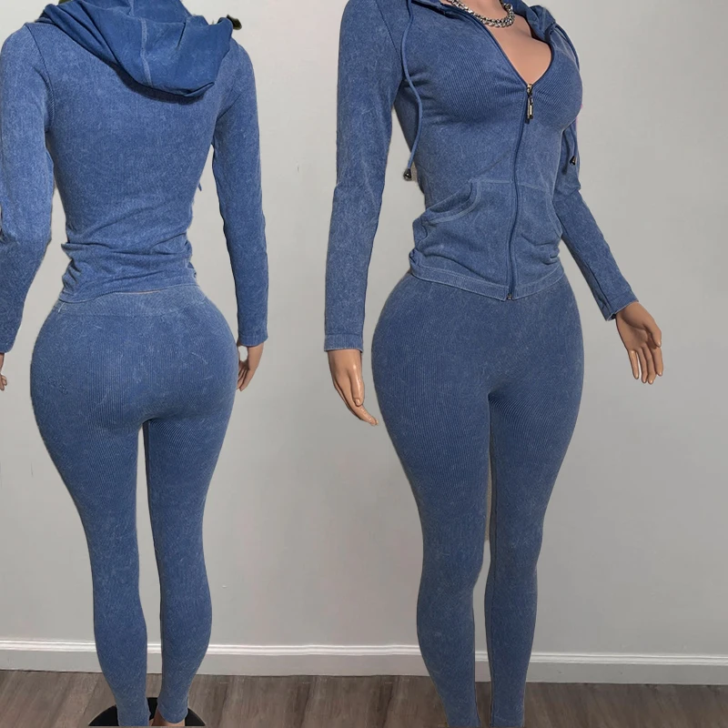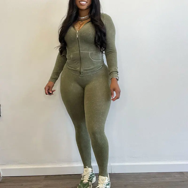 OEM High Quality Acid Wash Skinny Two-Piece Sports Loungewear Zip Hooded Short Legging Workout Sets for Women Manufactured Huili